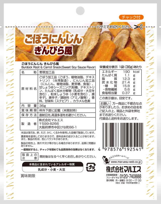 - 野菜加工品(ごぼう、植物油脂、デキストリン)(台湾製造)、にんじん加工品(にんじん、植物油酢、麦芽糖、食塩)、甘しょうゆシーズニング[粉糖、デキストリン、たんぱく加水分解物(乳成分・大豆を含む)、粉末しょうゆ(小麦を含む)、唐辛子]、唐辛子/調味料(アミノ酸等)、香料、甘味料(ステビア)、カラメル色素