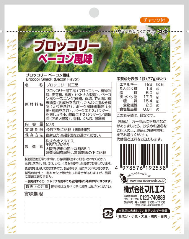 - ブロッコリー加工品(ブロッコリー、植物油脂、麦芽糖、食塩)(ベトナム製造)、ベーコン風シーズニング[砂糖、食塩、でん粉、粉末油脂(乳成分を含む)、たんぱく加水分解物(大豆を含む)、ポーク風味調味料(小麦・鶏肉を含む)、ポークエキスパウダー、粉末しょうゆ、酵母エキスパウダー]/調味料(アミノ酸等)、香料、くん液、酸味料